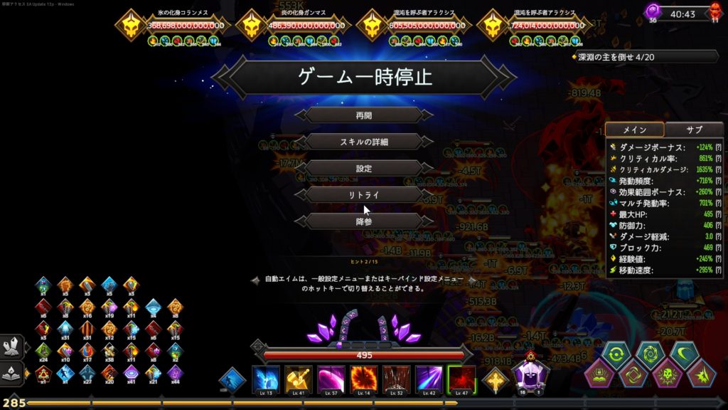 画像ではボス4体のためHPが表示されきれていませんが、2500兆程度。