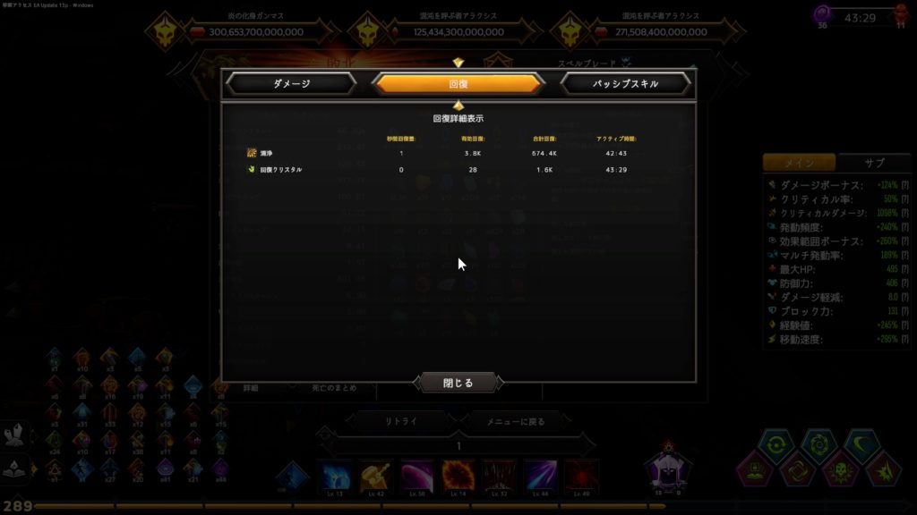 回復詳細表示で見ると、回復がなかったら10回死ぬ程度ダメージを受けています。