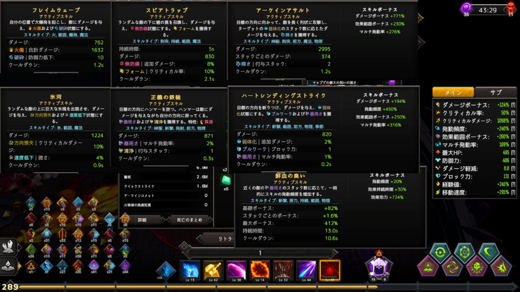 (鮮血の臭いの効果は、説明文では敵の器用さのスタック数に応じてとなっていますが、それぞれのスキルのクールダウンを見ると自分の器用さに応じている気がします。)