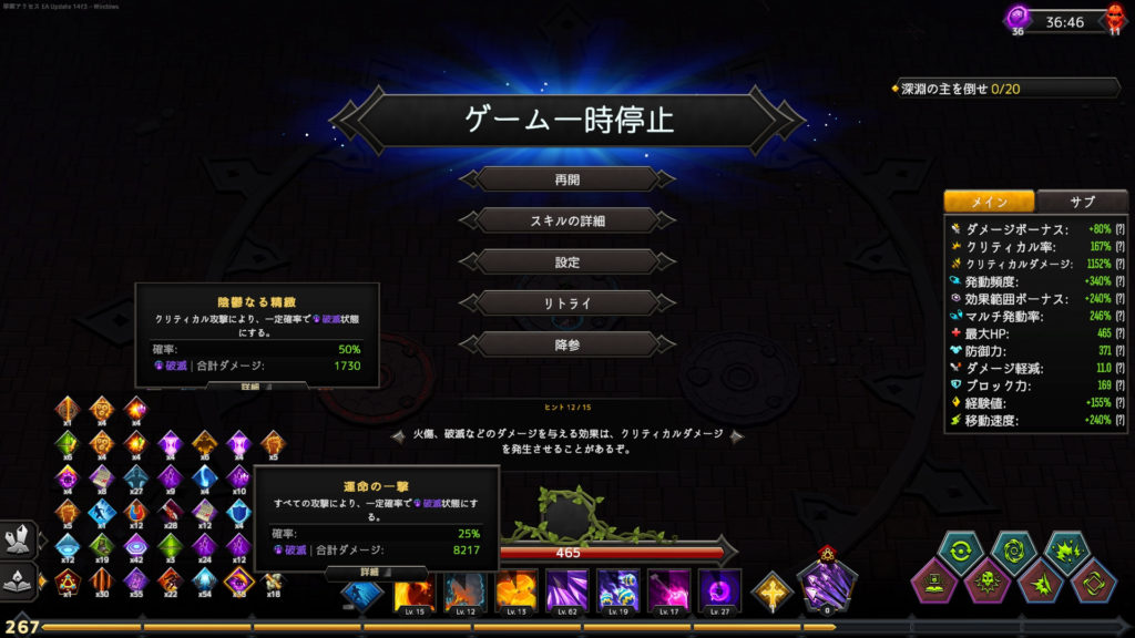 確率で破滅状態にする運命の一撃と陰鬱なる精緻のレベルも上げていき、スキル「シャドウスパイク」で破滅のスタック数に応じての大ダメージを狙っていきます。