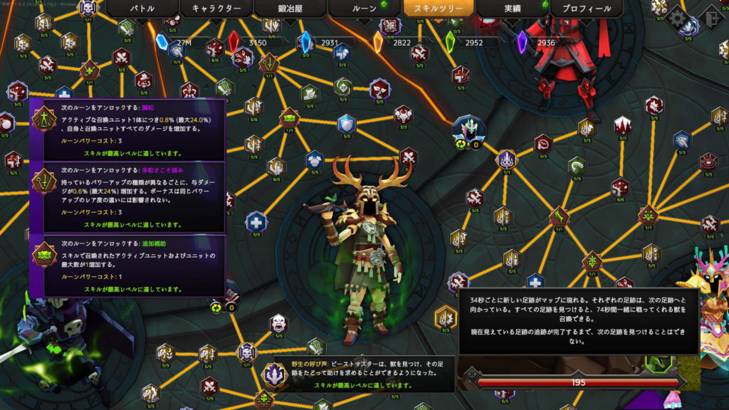 【Soulstone Survivors】ビーストマスターのアセンション・スキル・アーティファクトパワー・ビルド例 Hidden X Facebook はてブ LINE コピー 2025.01.262025.10.27 ビーストマスターのアーティファクトパワー監視する鷹。 自分の周囲を飛び回る鷹を解き放ちダメージ、追加効果を与える。 ビーストマスターで取得できるルーンとアセンション 【Soulstone Survivors】 攻略記(2025.12.10更新)Soulstone Survivorsはヴァンパイアサバイバーズ風のGameですが、一定時間戦って生き延びるシステムではなく、ボスを倒して次のシーンに進んでいくシステム。ゲームを進めていっての攻略ポイント等を載せていきますので、参考になれば...