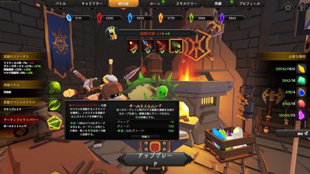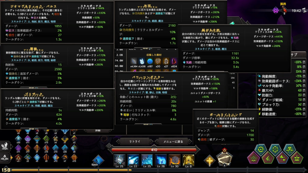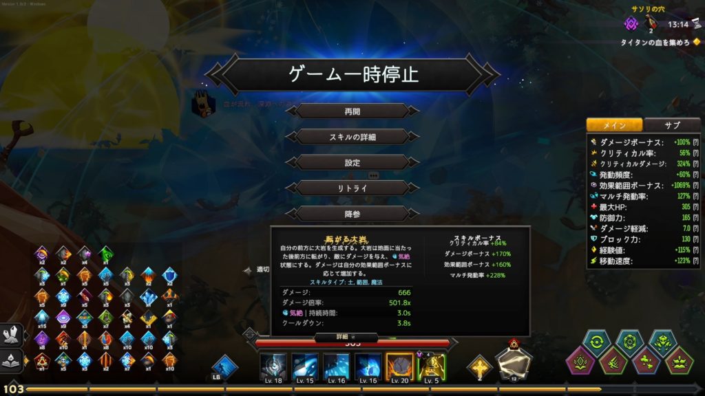 転がる大岩のダメージ倍率は500超と狙い通りで、更に効果範囲が増している為に巨大な転がる大岩が敵をまとめて消滅させられる状態に。