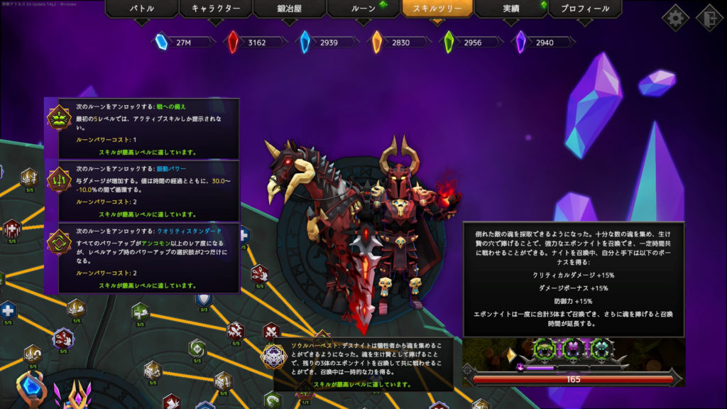 【Soulstone Survivors】デスナイトのアセンション・スキル・アーティファクトパワー・ビルド例 Hidden X Facebook はてブ LINE コピー 2025.01.272025.07.15 デスナイトのアーティファクトパワードラゴンの飛行。 ドラゴンは敵にダメージを与え、状態異常にするエリアを残す。 デスナイトで取得できるルーンとアセンション ビルド例は5つ目の武器が開放されたら更新する予定。 【Soulstone Survivors】 攻略記(2025.12.10更新)Soulstone Survivorsはヴァンパイアサバイバーズ風のGameですが、一定時間戦って生き延びるシステムではなく、ボスを倒して次のシーンに進んでいくシステム。ゲームを進めていっての攻略ポイント等を載せていきますので、参考になれば...