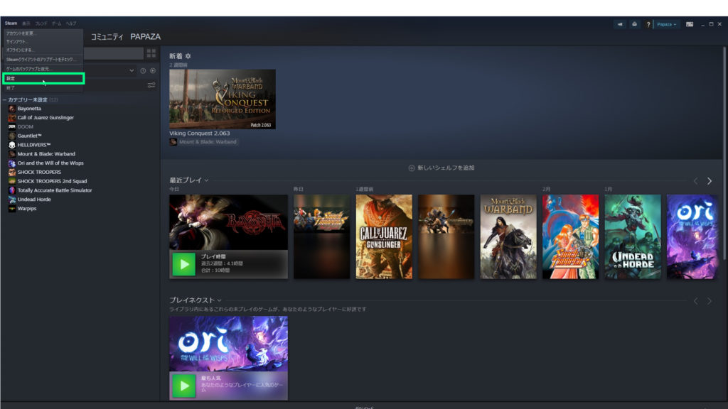 設定方法は、Steamクライアント画面左上のSteamの項目の中の設定をクリック。