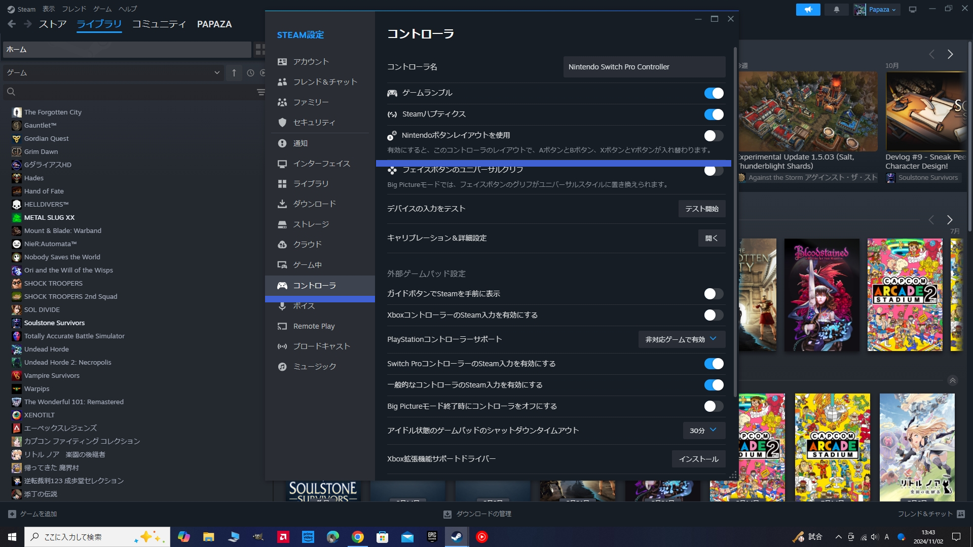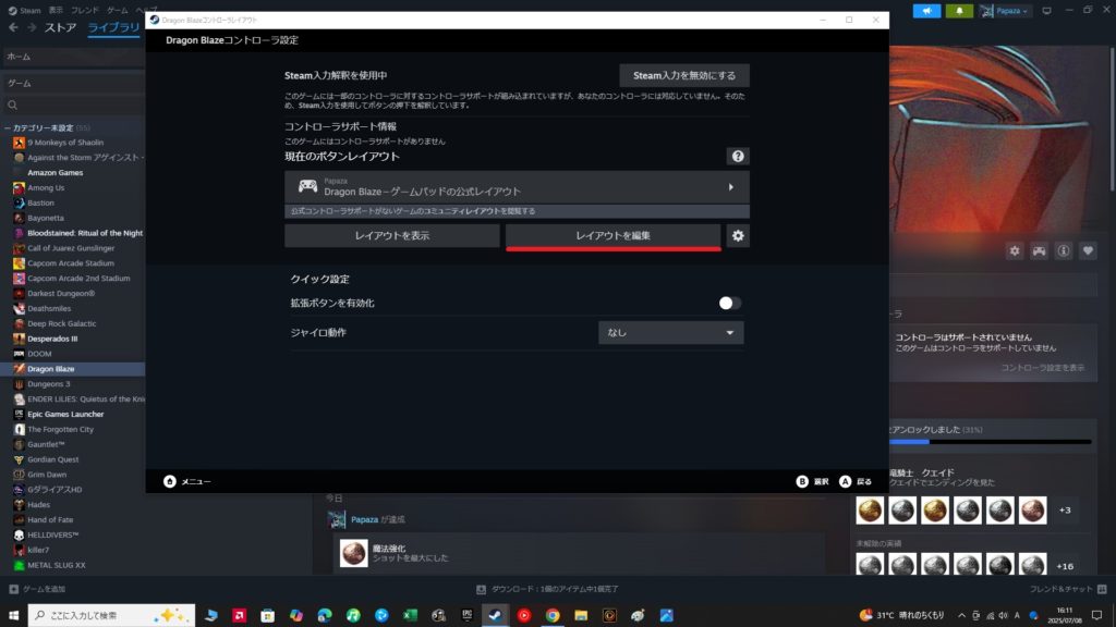 XボタンとYボタン、AボタンとBボタンがそれぞれ入れ替わり、Steamのゲーム画面の通りのボタン配置で快適にプレイ出来るようになります。