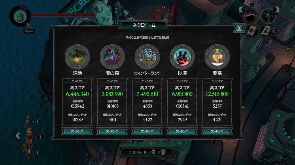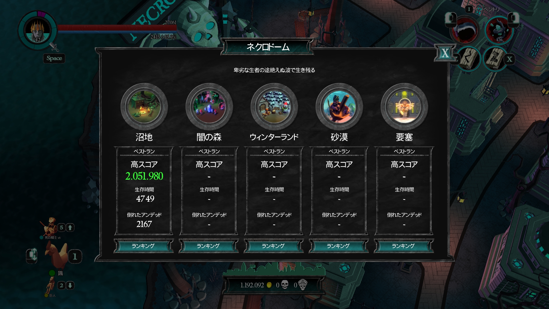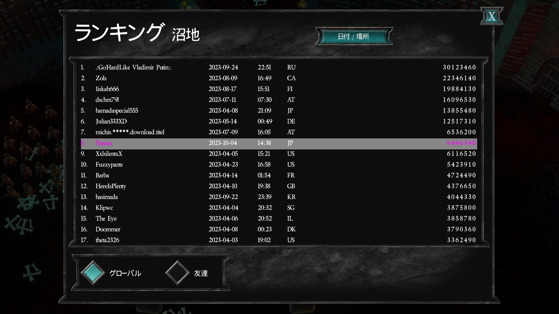 ・・・マップ沼地の波111でPCがフリーズしてしまい、2時間程度のプレイのスコアが消えるトラブルがあったため、次からのマップでは1時間程度で進めるところまででのランクインを目指していきます。