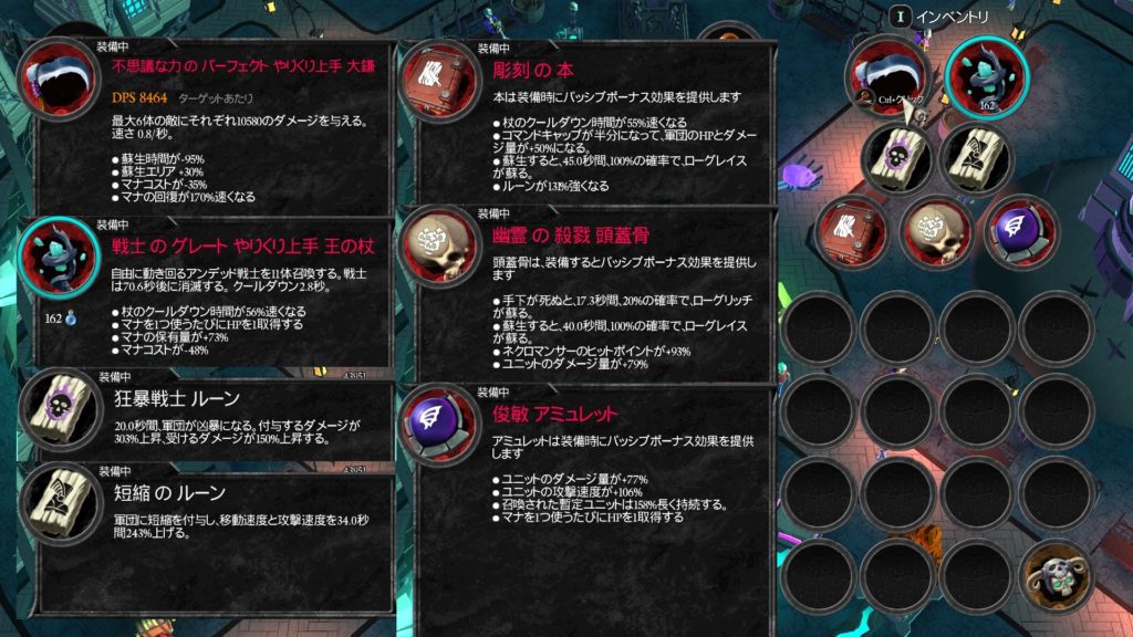 主な戦い方は、マナコストを抑えてクールダウンを短縮した杖でアンデッド戦士を召喚、召喚されたアンデッド戦士が倒された時に20%の確率でローグリッチが発生。彫刻の本で強化されたルーンを発動でラッシュ。押されてピンチの時も、死体1体復活につきローグレイス2体も発生する為、死体さえ落ちていれば大抵立て直せます。