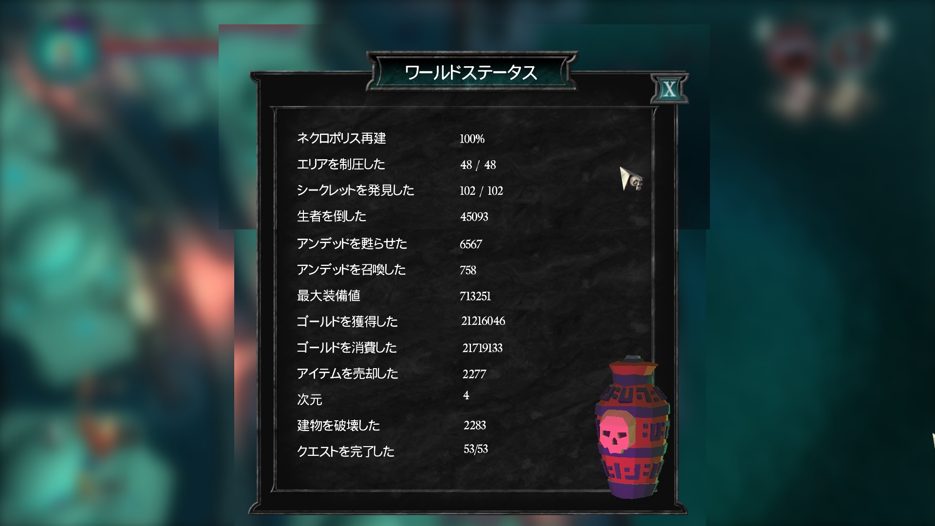 次元4のストーリを終えたあたりで、ネクロポリスMAP右の方角にある「ワールドステータス」のネクロポリス再建も100%を達成。